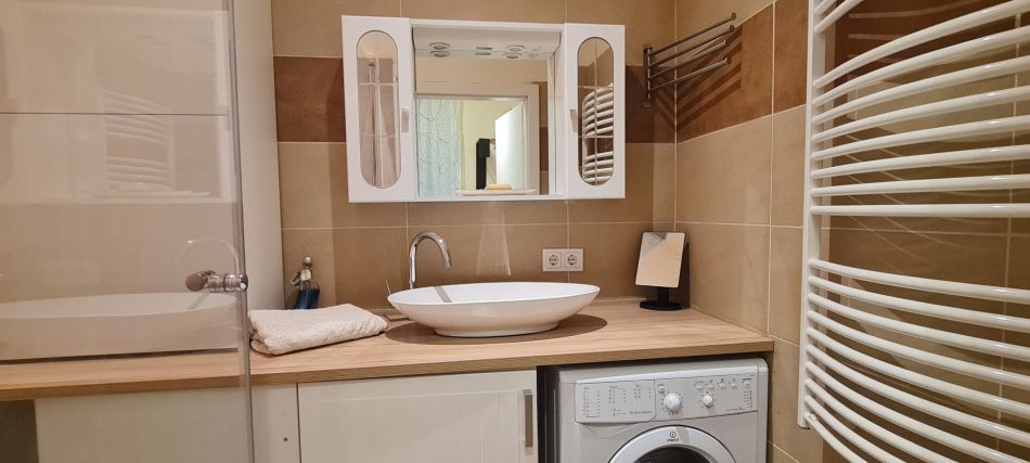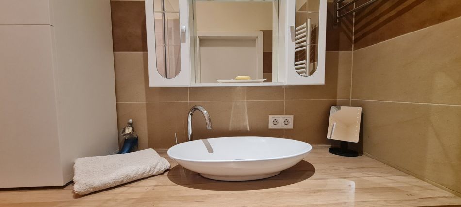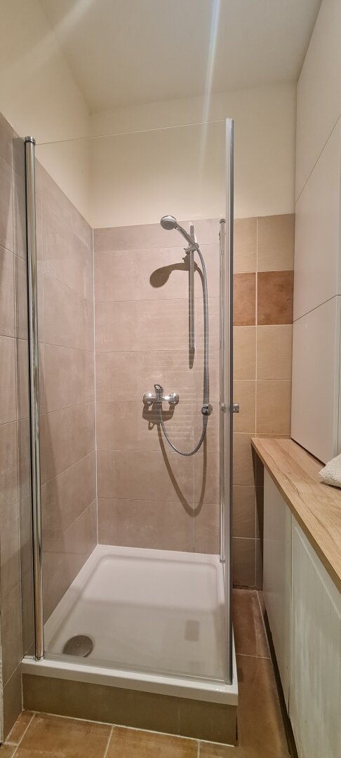 Das Badezimmer ist verfliest und mit einer Dusche und einem Spiegelschrank ausgestattet. Platz für eine Waschmaschine ist samt Anschlüssen dazu vorhanden.