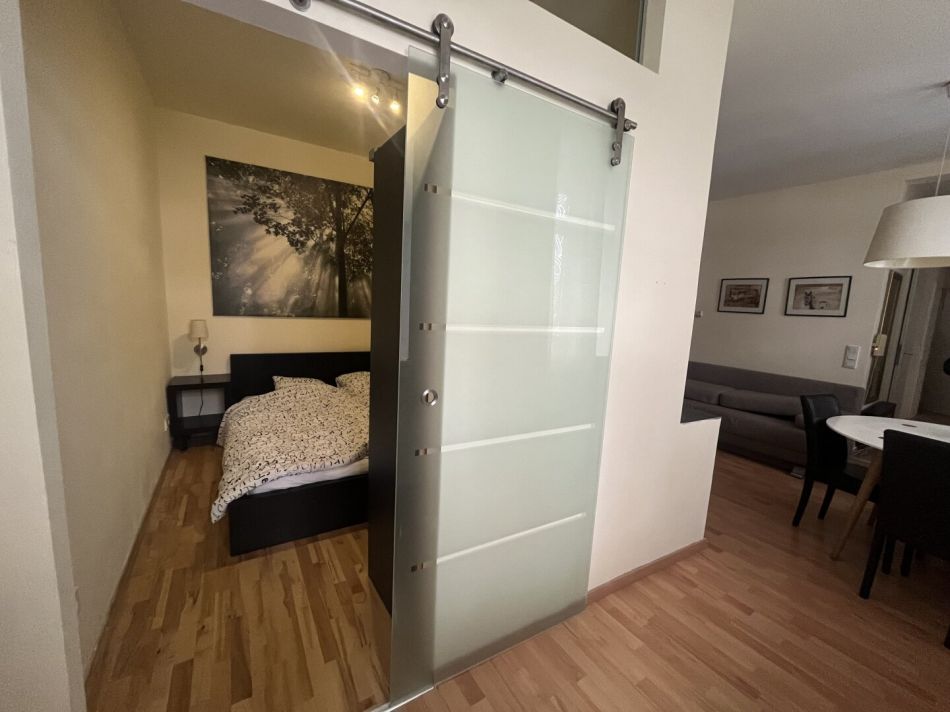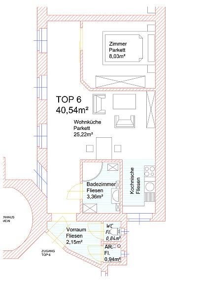 Das voll möblierte Wohnbüro verfügt über einen (Büro)Raum mit Kochnische, einen separaten Schlafbereich sowie Badezimmer, separates WC, Abstellraum und Vorzimmer.