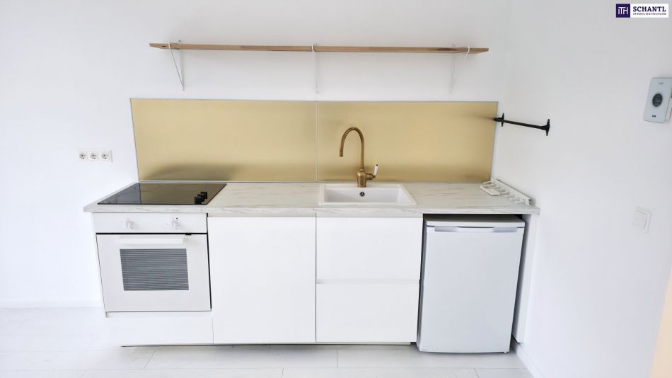 Der offen gestaltete Wohnbereich überzeugt durch eine bereits integrierte Einbauküche. Moderne goldene Akzente verleihen der Küche sowie dem Wohnbereich einen eleganten und stilvollen Charakter.