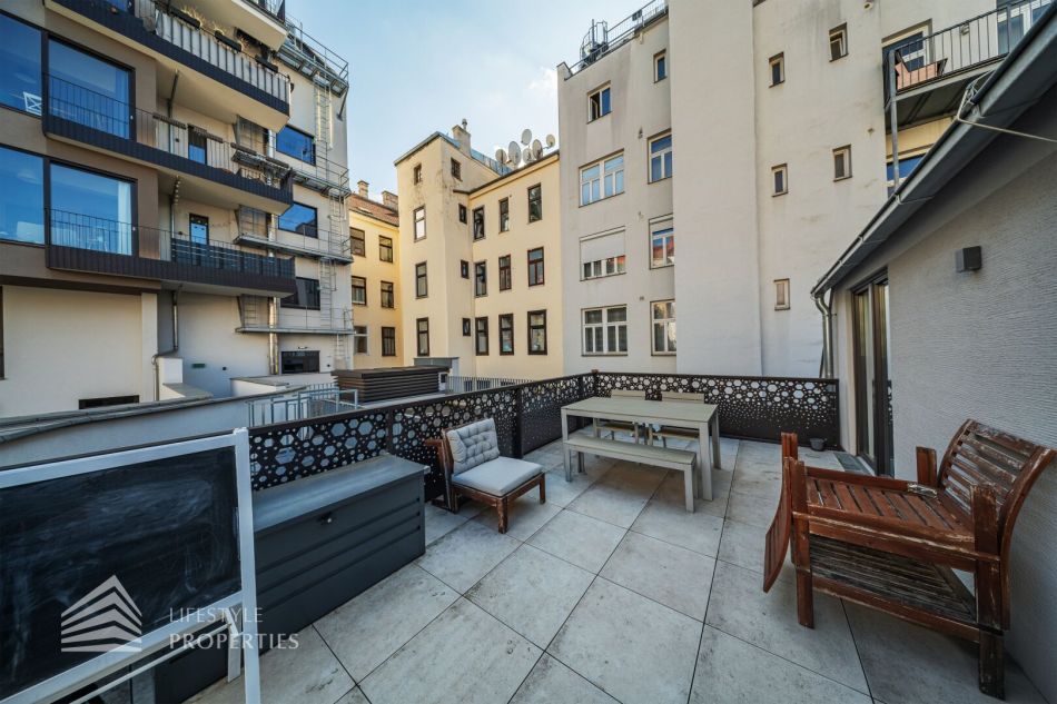 Zur Vermietung gelangt eine traumhafte 4-Zimmer Wohnung mit Balkon und 2 Terrassen im wunderschönen 5. Wiener Gemeindebezirk Margareten.Die Immobilie befindet sich im Dachgeschoss im Innenhofgebäude eines im Jahre 1971 erbauten, gepflegten Hauses und erstreckt sich über eine Wohnfläche von ca. 83 m². Die Wohnung teilt sich in eine große Wohnküche, drei Zimmer, einen Balkon, eine Terrasse, ein Badezimmer, einen Vorraum, und eine separate Toilette auf. Die Haupträume sind mit einem hochwertigen Parkettboden ausgekleidet, der Vorraum sowie die Nassräume sind gefliest. Die Wohnung verfügt in allen Räumen über eine Fußbodenheizung sowie über ein eigenes Kellerabteil.