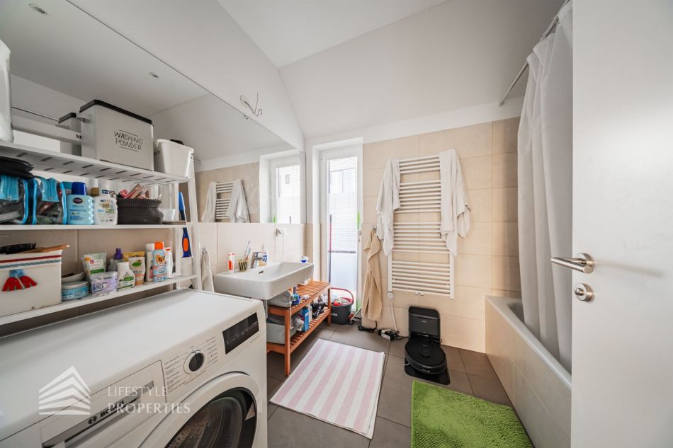 Sie betreten die Wohnung über eine der Terrassen und befinden sich im Vorraum, von hier gelangen Sie in die große, lichtdurchflutete Wohnküche. Die Küche ist mit modernen und hochwertigen Küchengeräten ausgestattet. Von hier gelangen Sie auch auf den schönen Balkon. Über einen Gang gelangen Sie zu den drei getrennt von einander begehbaren Schlafzimmern, eines davon hat direkten Zugang zur großen Terrasse. Das Bad ist mit einer Badewanne, einem Waschbecken und einem Waschmaschinenanschluss ausgestattet. Die Toilette befindet sich direkt neben dem Badezimmer.