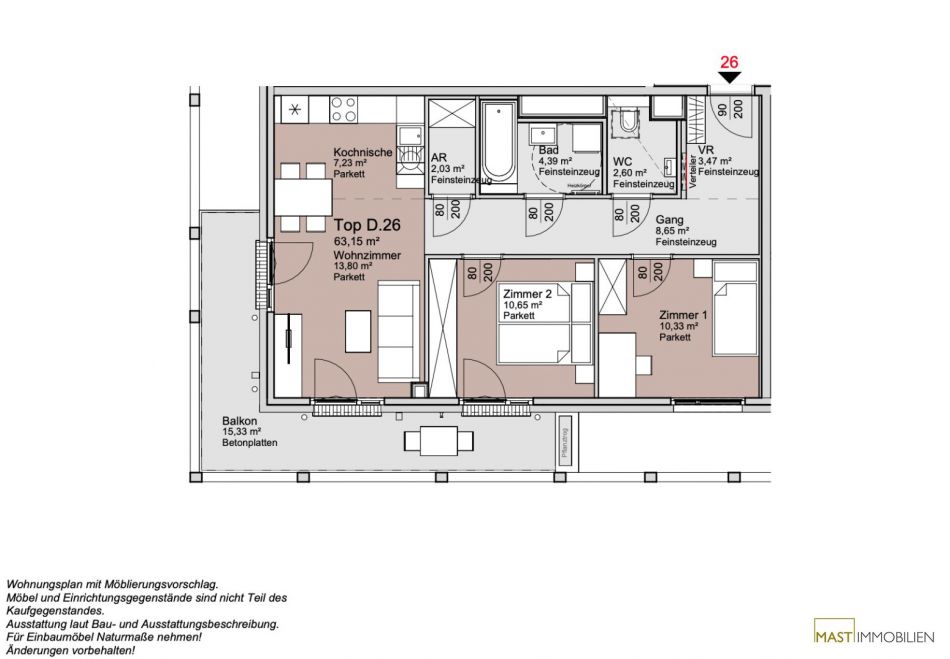 Die Wohnung befindet sich im 3. Liftstock und verfügt über 63,15 m² Wohnfläche + 15,33 m² große Freifläche.