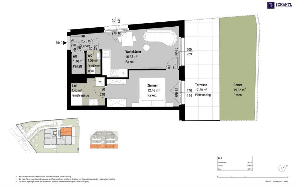 Wohnfläche: ca. 39,07m² + Terrasse: ca. 17,89m² + Eigengarten: ca. 19,07m² + Kellerabteil