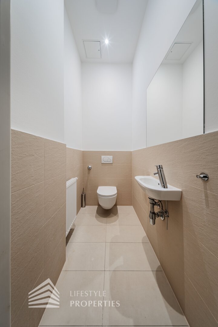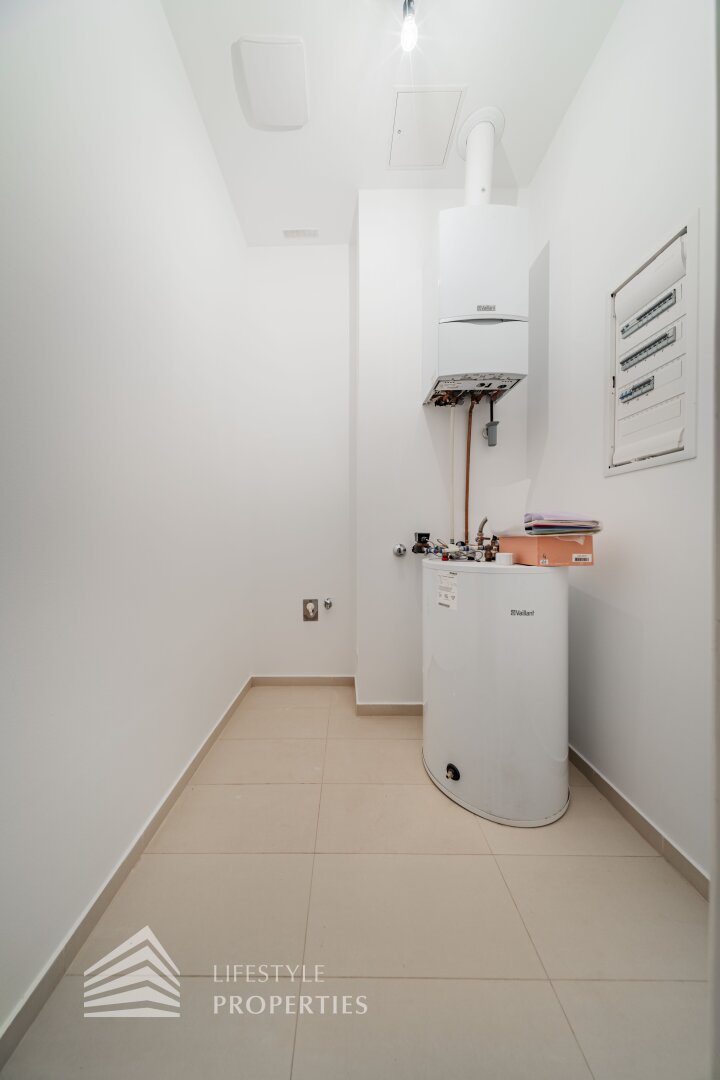 Sie betreten die Wohnung und befinden sich im Vorraum, gerade durch gelangen Sie in den großen Salon, der genug Platz für eine gemütliche Sitzecke und einen Esstisch bietet. Vom Entrée links in den Flur befindet sich linkerhand die komplett ausgestattete, neue Küche mit Fenster. Rechts gelangen Sie in eines der Zimmer mit en-suite Badezimmer, welches mit einer Dusche und einem Waschbecken ausgestattet ist. Im Flur weiter gerade durch gelangen Sie in das zweite und sehr geräumige Zimmer mit en-suite Badezimmer. Dieses ist mit einer Badewanne, einer Dusche, einem Doppelwaschbecken, einem Handtuchtrockner und einem WC ausgestattet. Zwischen Zimmer und Bad befindet sich ein Raum, der sich perfekt als Schrankraum eignen würde. Der Abstellraum ist mit einem Waschmaschinenanschluss ausgestattet und befindet sich so wie die separate Toilette im Vorraum.