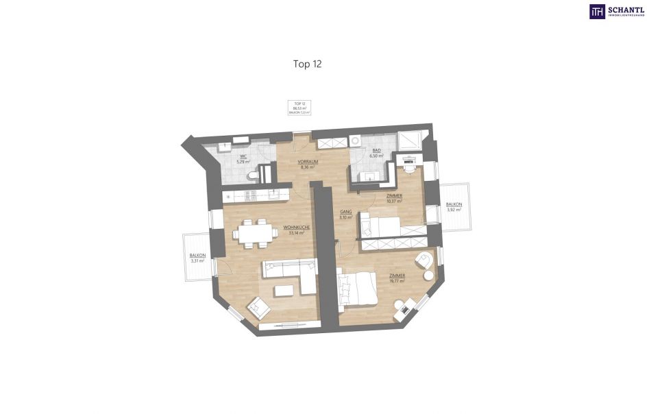 Der helle Wohn-Essbereich mit direktem Zugang zum Balkon ist perfekt für gesellige Stunden oder ruhige Momente im Freien. Die beiden Schlafzimmer bieten viel Platz und Flexibilität für Familien, Paare oder die Nutzung als Arbeits- oder Gästezimmer. Das stilvolle Badezimmer und das separate WC sorgen für zusätzlichen Komfort. Ein praktisches Vorzimmer rundet die gut durchdachte Raumaufteilung ab.