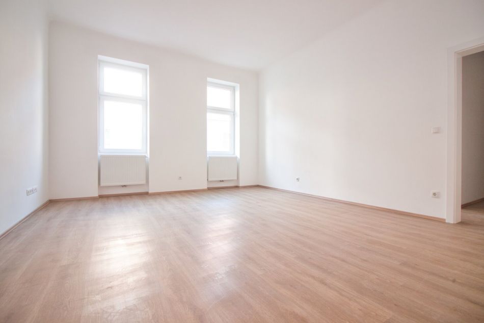 Das angrenzende, westseitige Wohnzimmer ist hell und lässt keine Wünsche offen: Platz für einen Essbereich und für eine gemütliche, ausziehbare Couchlandschaft ist ausreichend vorhanden. Vom Wohnzimmer aus kommen Sie in einen Gang, der ein gut geschnittenes Schlafzimmer und ein riesiges Badezimmer erschließt, das mit Badewanne, Doppelwaschtisch und einem elektrischen Handtuchheizkörper ausgestattet ist.