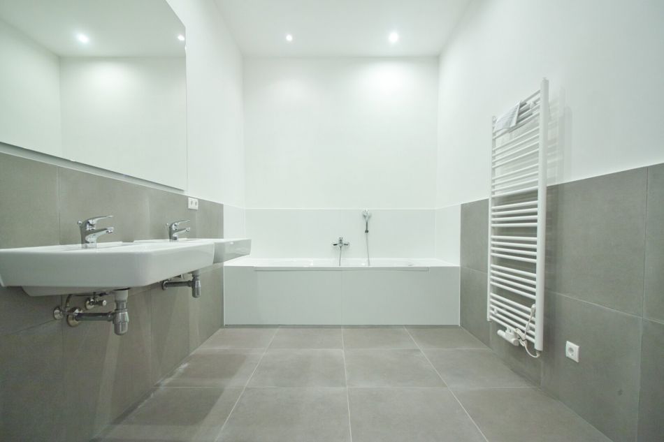 - Badezimmer mit Badewanne, Waschtisch und Handtuchheizkörper