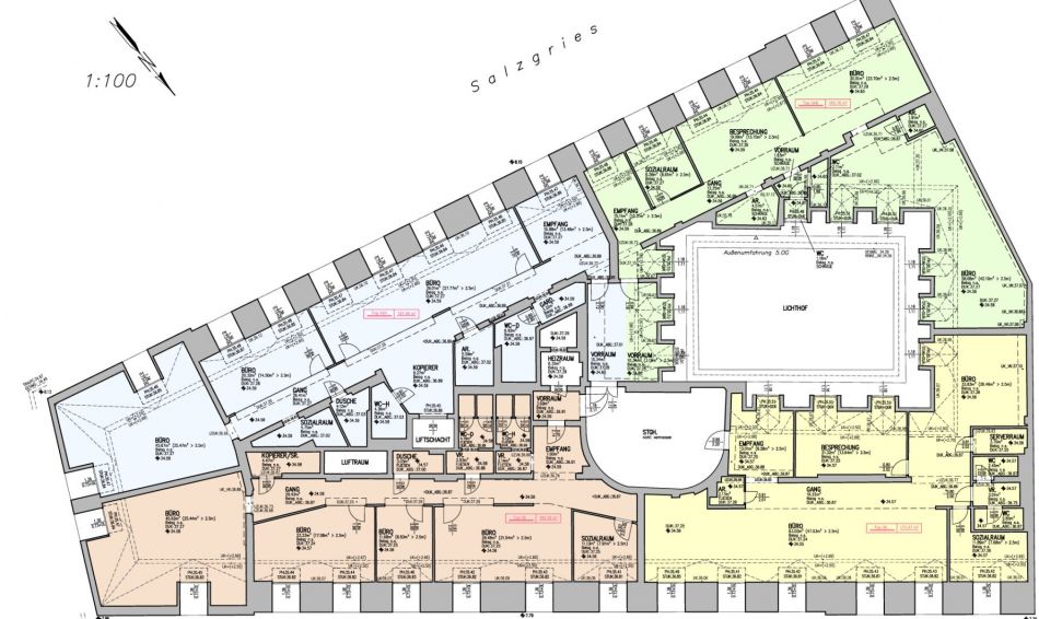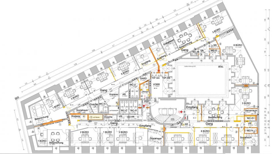 Beim Betreten des Büros steht man direkt im ca. 21 m² großen Vorraum, dieser mit dem angrenzenden Büro geteilt ist. Beim Eingang befindet sich der ca. 15 m² große Empfang. Durch einen ca. 12 m² langen Gang gelangt man zu den einzelnen Büroräumen. Auf der linken Seite des Ganges befindet sich ein Sozialraum mit einer Teeküche sowie auf der rechten Seite die Toiletten für die Damen und Herren und einen Serverraum. Die Fläche des Heizraumes wird auf vier Einheiten aufgeteilt.