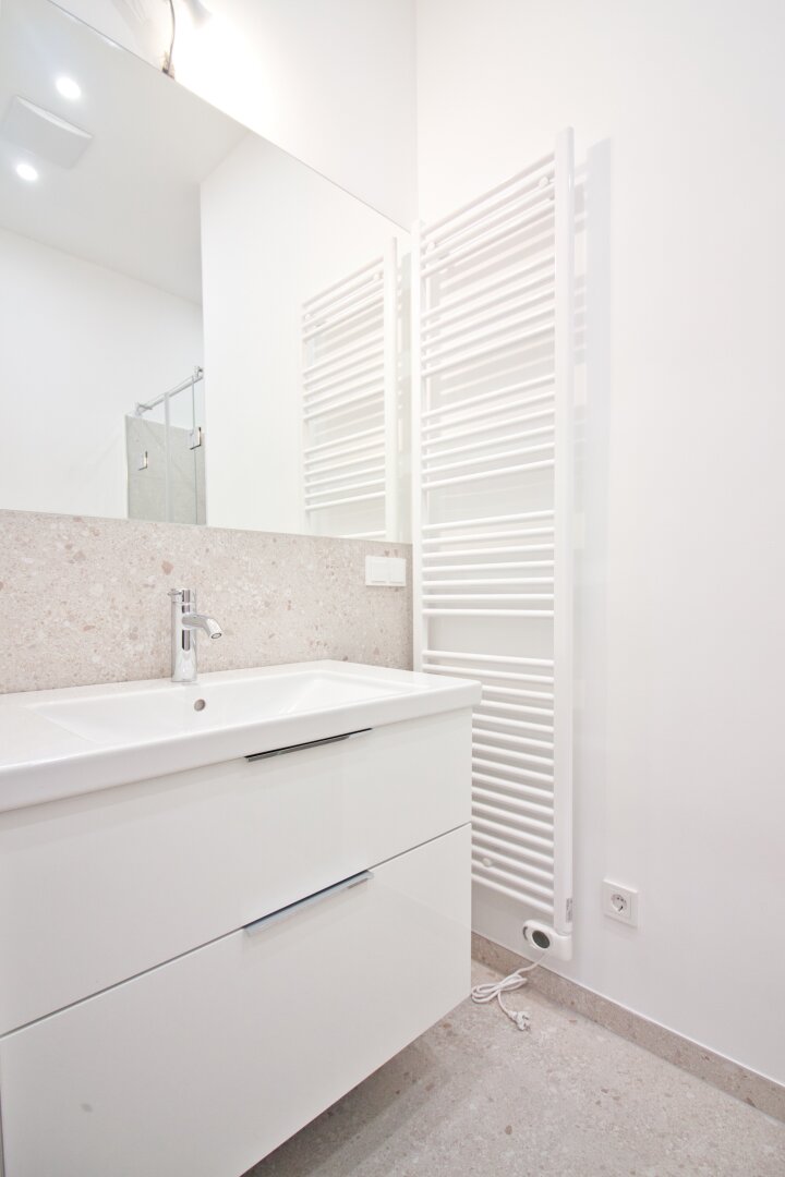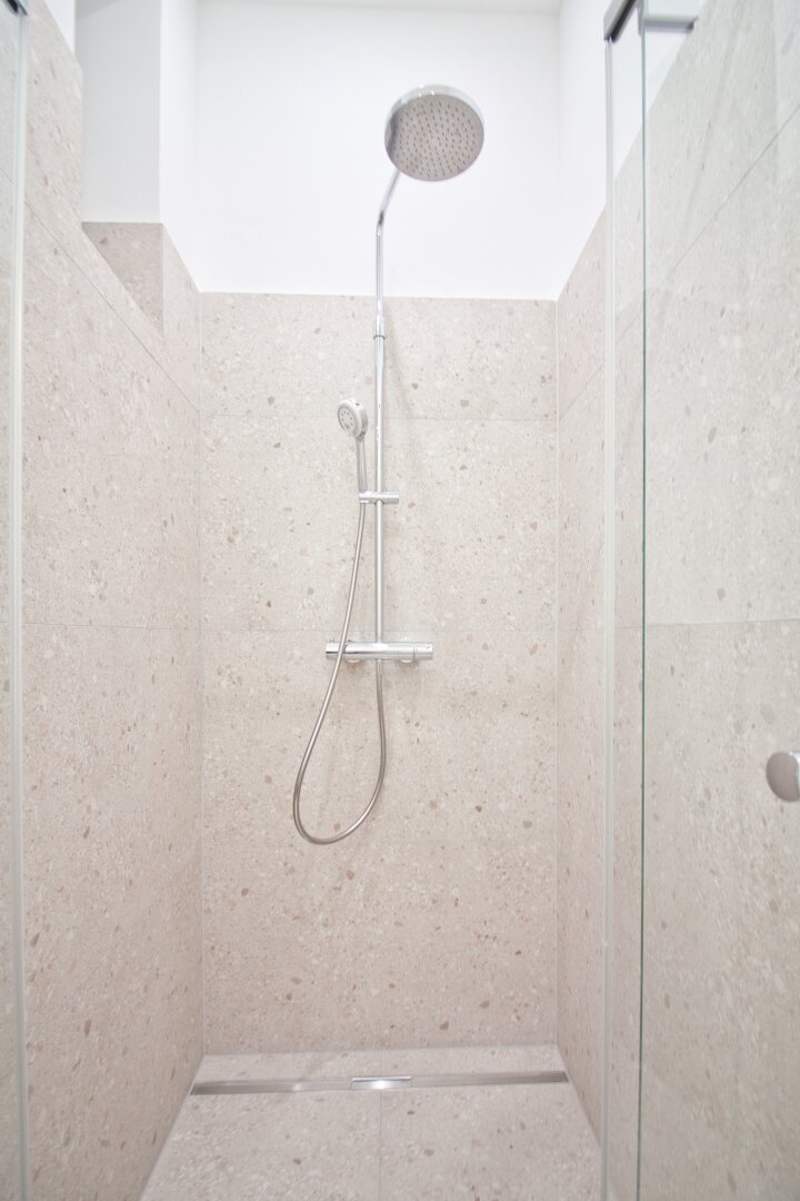 Direkt neben dem Eingang befindet sich das Badezimmer mit bodengleicher Regenwalddusche, Waschtisch mit Unterschrank, einem elektrischen Handtuchheizkörper und einem WC.