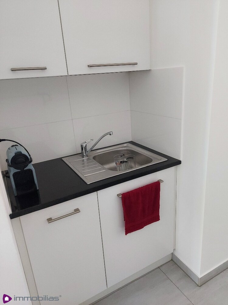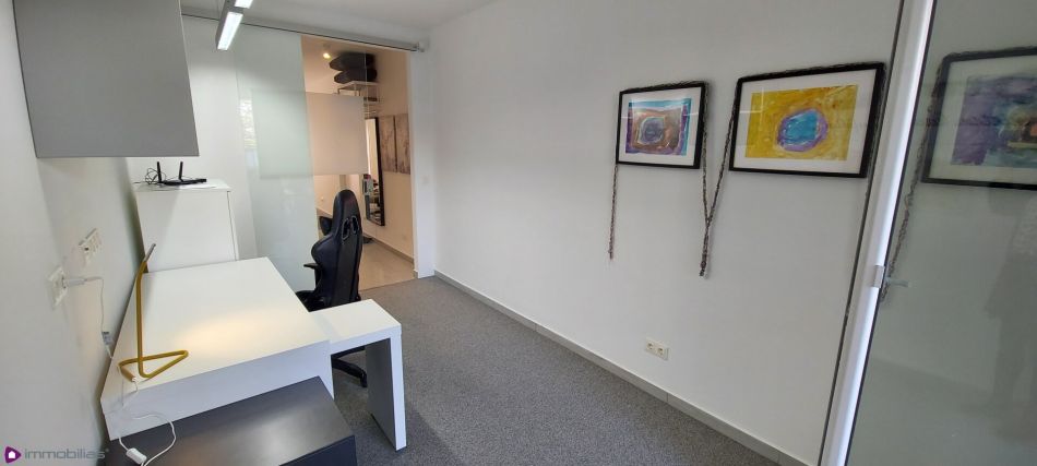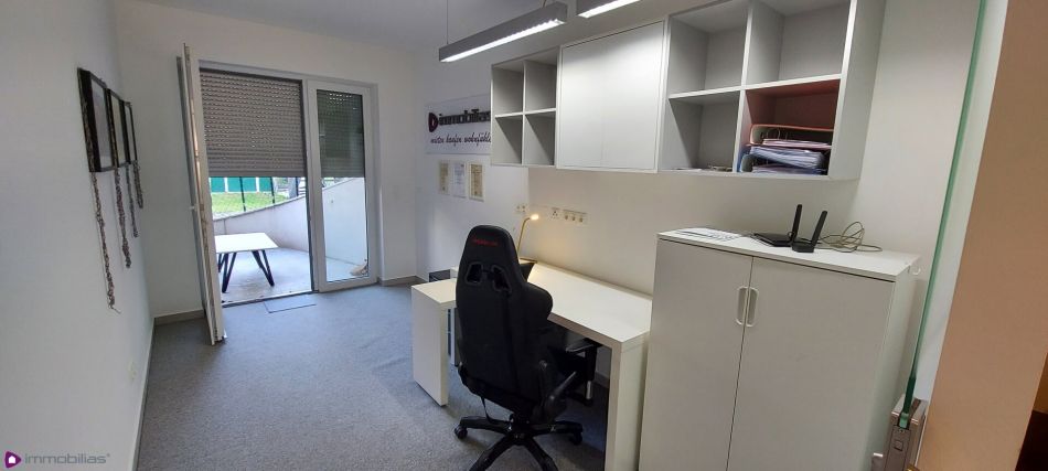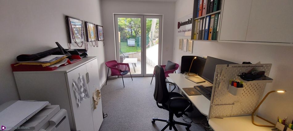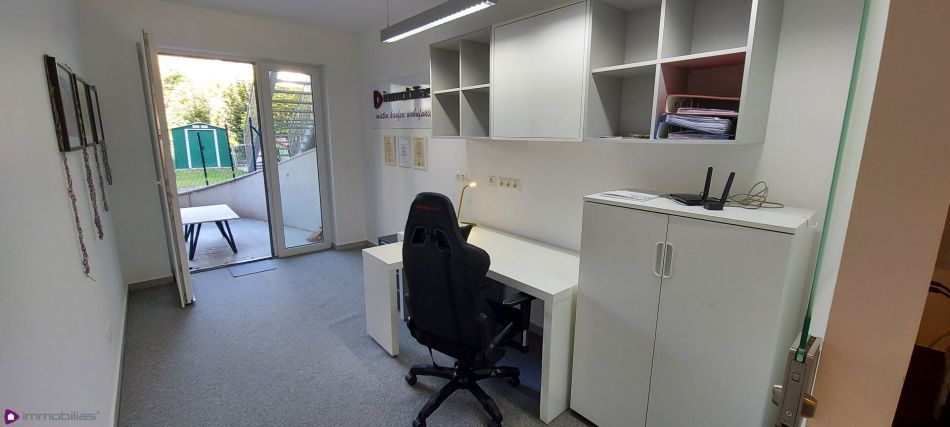 Die kleine Küche ist einfach möbliert. Eine Abwasch, Ober- und Unterschrank und eine Kapsel-Kaffeemaschine sind vorhanden. Der Arbeitsplatz verfügt über einen neuwertigen weißen Eck-Schreibtisch, Hängeregale und einen Aktenschrank, sowie über einen Bürosessel. Im ganzen Objekt ist eine Fußbodenheizung verlegt, Alarmanlage, Glasschiebetür mit Schloss, robuster Teppich (grau);