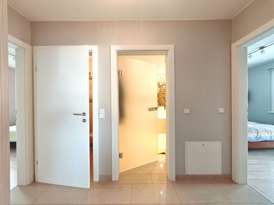 Zur Ausstattung gehören: KLIMAANLAGE, Video-Gegensprechanlage, Doppelbetten, Schränke, Esstisch mit Stühlen, Ledersitzgruppe, Terrassenmöbel, Whirlpool-Waschmaschine, Bidet-Brause, Innenjalousien, Geschirr, Beleuchtung und Fernseher.