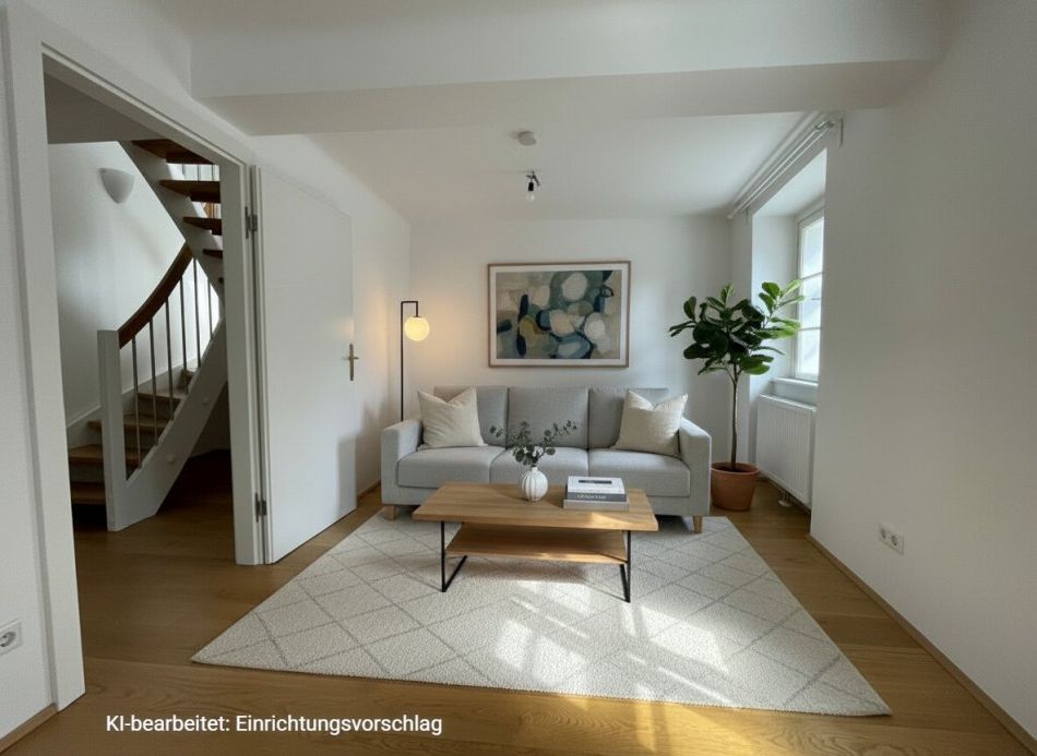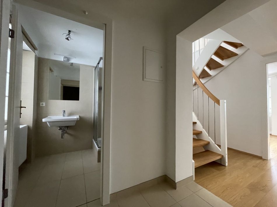 Im Eingangsbereich führen Stiegen in das obere Stockwerk der Wohnung. Dort befindet sich eine großzügige Galerie mit ca. 27 m², die als weiterer Wohn- oder Arbeitsbereich genutzt werden kann. Zu beachten ist, dass dieser Bereich offen gestaltet ist und nicht durch eine Tür abgetrennt ist! Zusätzlich steht im Obergeschoss ein weiteres, separat begehbares Zimmer mit ca. 13 m² zur Verfügung.