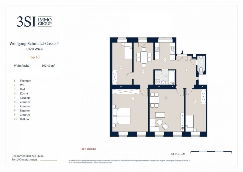 Zum Verkauf gelangt eine helle 4-Zimmer Wohnung mit ca. 102 m² Wohnfläche im 2. Wiener Gemeindebezirk.Die Wohnung befindet sich im 1. Stock und teilt sich in einen Vorraum, einen Wohnraum, drei Zimmer, eine Essdiele, eine Küche, ein Badezimmer und ein separates WC. Die Wohnräume sind mit einem schönen Parkettboden ausgestattet und die Nassräume sind verfliest. Beheizt wird mittels Gas-Etagenheizung.