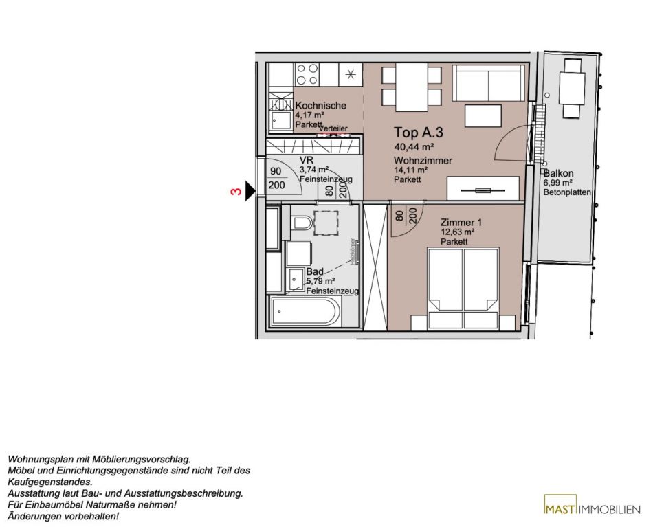 Die Wohnung befindet sich im 1. Liftstock und verfügt über 40,44 m² Wohnfläche + einen 6,99 m² großen Balkon.