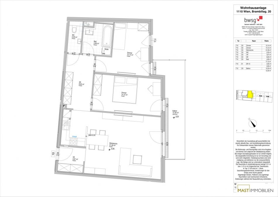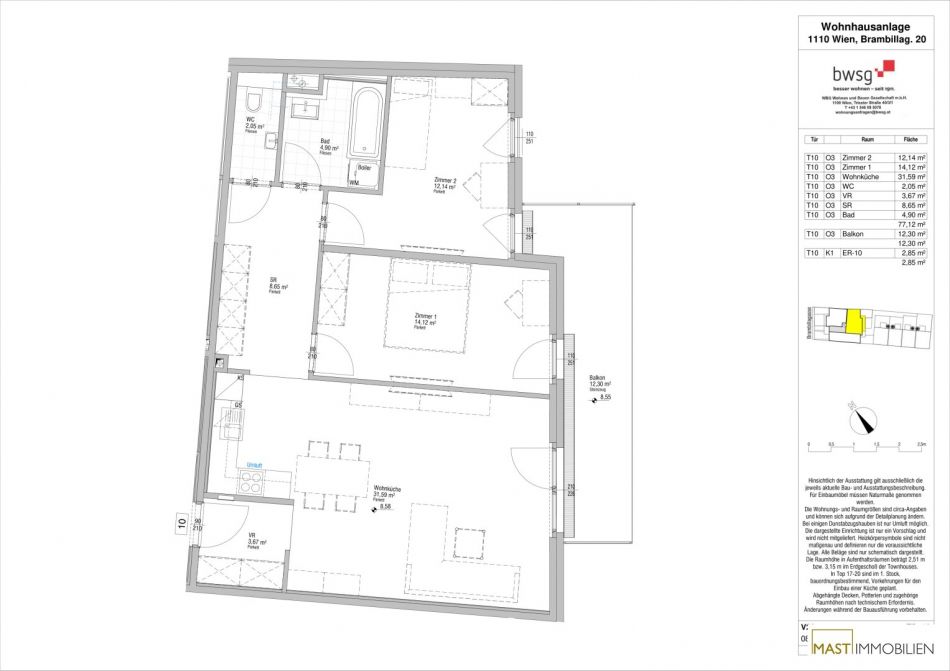 Die Wohnung befindet sich im 3. Liftstock und verfügt über 77,12 m² Wohnfläche + einen 12,30 m² großen Balkon.
