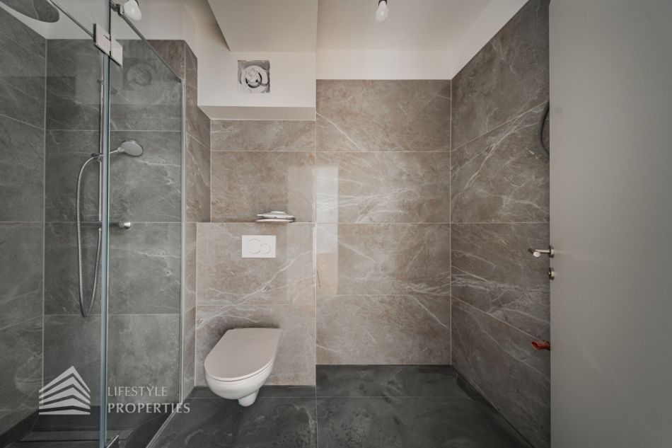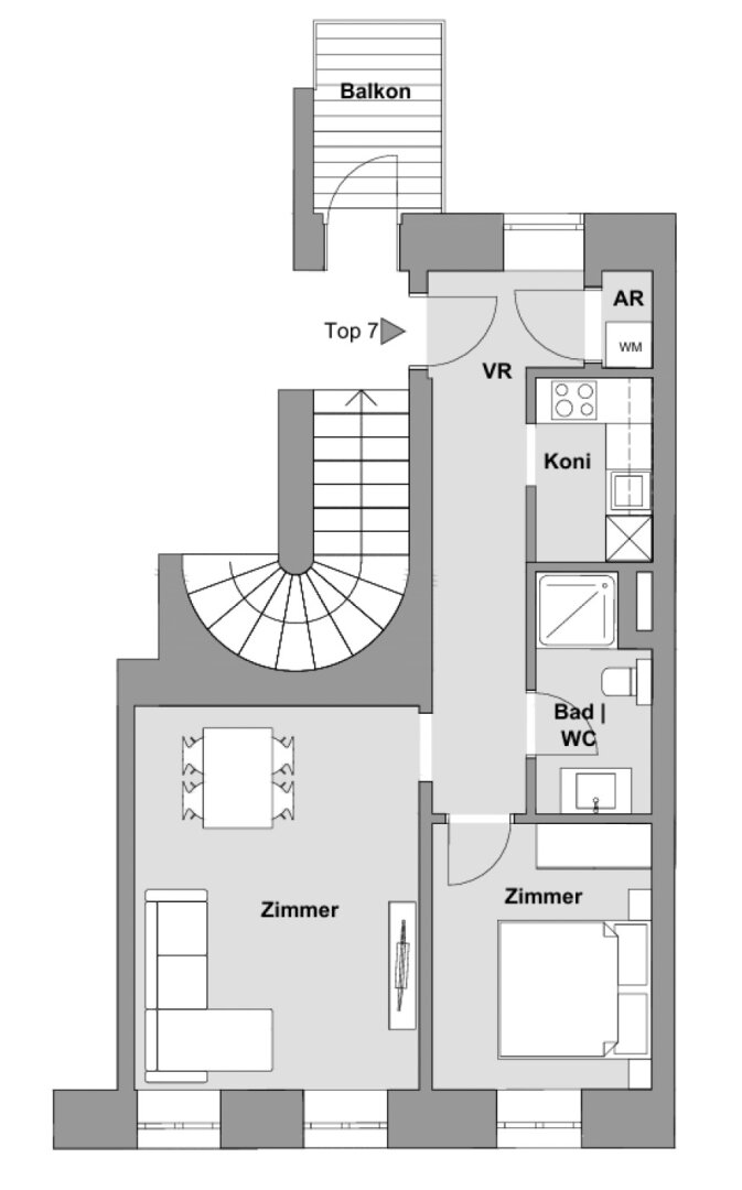 Der Vorraum bietet Zugang zum praktischen Abstellraum mit Waschmaschinenanschluss. Vom Gang aus gelangt man in die Kochnische, die Küchenanschlüsse werden individuell nach Käuferwunsch vorbereitet. Ebenfalls vom Gang erreichbar ist das Badezimmer, das mit Dusche, WC und Waschbecken ausgestattet ist. Das Wohnzimmer bietet ausreichend Platz für einen Wohn- und Essbereich. Die Schlafzimmer ist sind ebenfalls zentral vom Gang aus begehbar. Der Wohnung ist ein ca. 4 m² großer, südwestlich und hofseitig ausgerichteter Balkon zugeordnet. Dieser ist über das Stiegenhaus zugänglich und verfügt über eine versperrbare Balkontür. Das moderne Badezimmer ist mit Dusche, WC und Waschbecken ausgestattet.