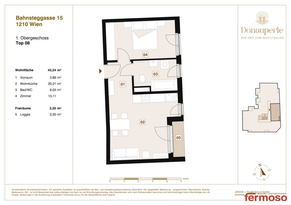 Im modernen Wohnprojekt „Donau Perle“ in der Bahnsteggasse 15 erwartet Sie diese 2-Zimmer-Neubauwohnungmit idealem Grundriss und hochwertiger Ausstattung. Die Wohnung bietet auf ca. 43,24 m² Wohnfläche und einer Loggia mit 2,20 m² ein durchdachtes Wohnkonzept – perfekt für Singles oder Paare, die modernes Wohnen in ruhiger Lage schätzen.