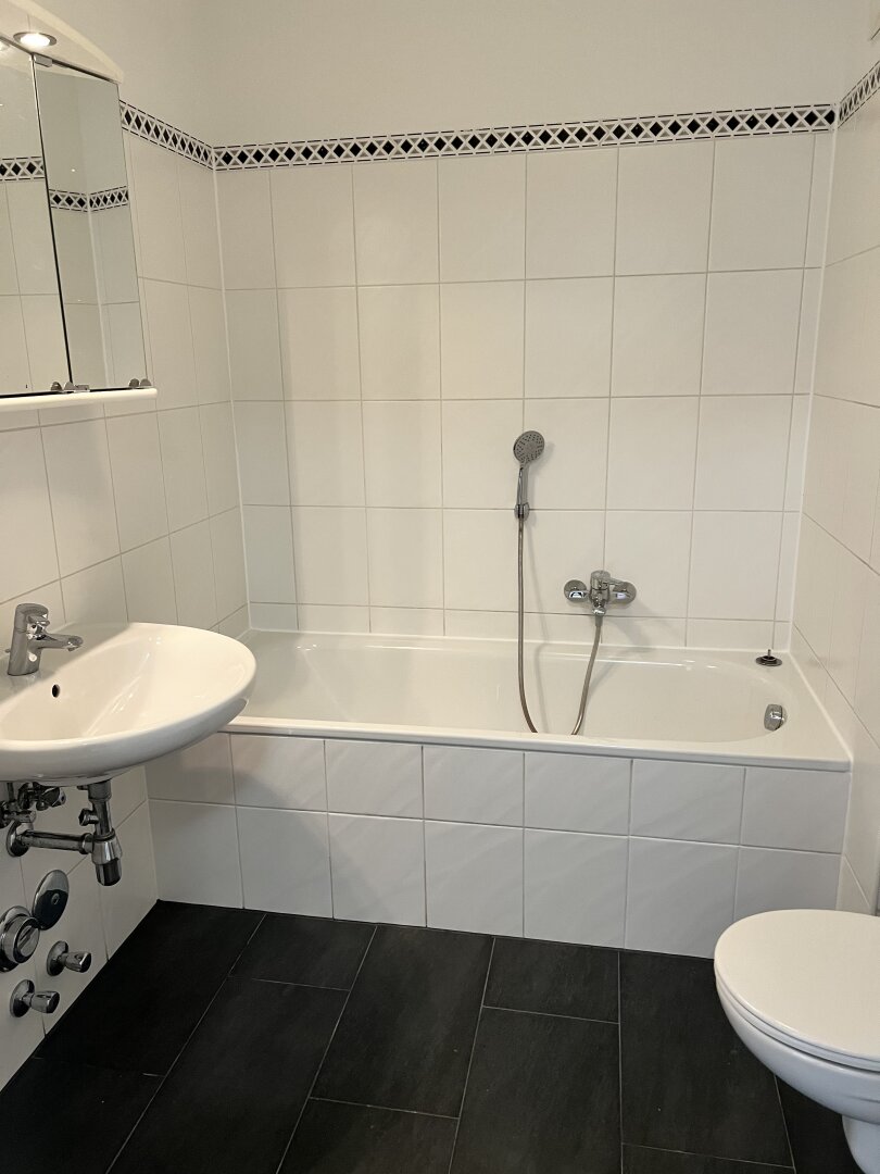 - Badezimmer mit Waschtisch, Badewanne und WC