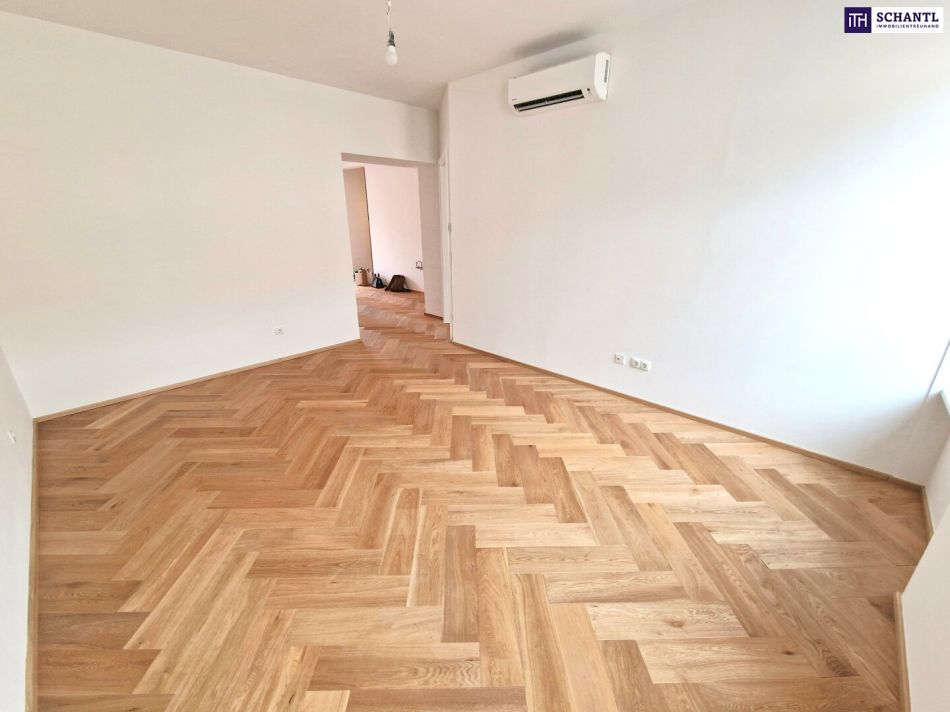 Ein hochwertiger Fischgrätparkettboden aus Eichenholz unterstreicht den klassischen Altbaucharakter, während Klimaanlagen in allen Wohnräumen für ein angenehmes Raumklima sorgen – zu jeder Jahreszeit. Beheizt wird die Wohnung über eine moderne Luftwärmepumpe, die sowohl umweltfreundlich als auch zukunftssicher ist.