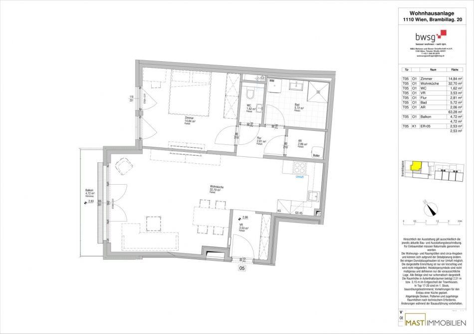 Die Wohnung befindet sich im 1. Liftstock und verfügt über 63,28 m² Wohnfläche + einen 4,72 m² großen Balkon.