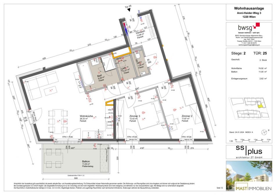 Die Wohnung befindet sich im 2. OG und verfügt über 74,92 m² Wohnfläche + eine 11 m² große Freifläche.