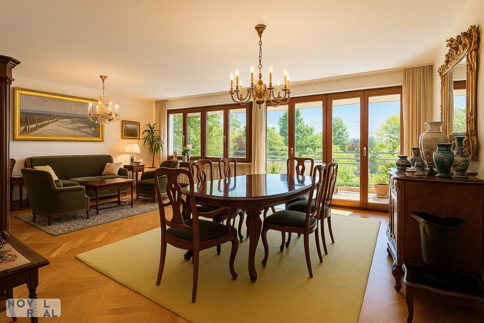 Ein weitläufiger Wohn- und Essbereich, der durch große Fensterflächen von Tageslicht durchflutet wird und einen direkten Zugang zur Loggia bietet. Der Ausblick schafft eine Verbindung zwischen Innen und Außen – ein Ort, an dem man den Tag mit Weitblick und Gelassenheit genießen kann