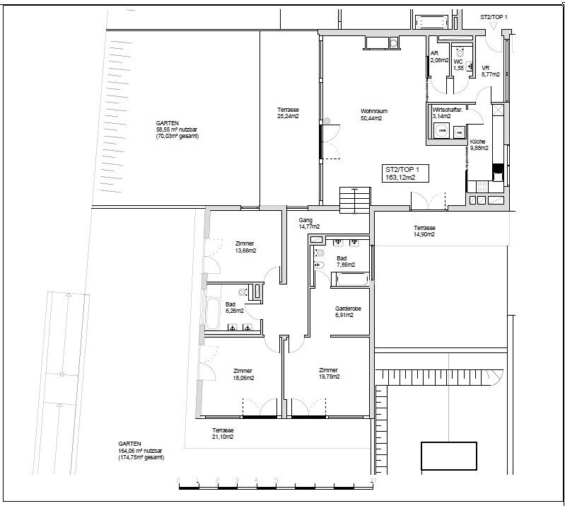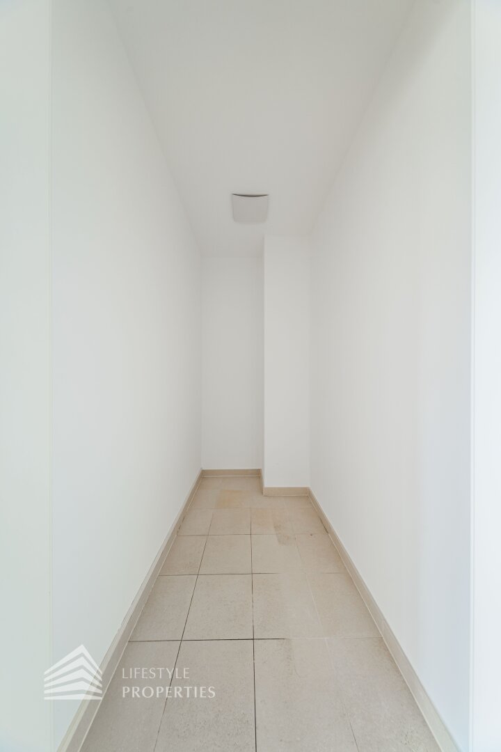 Sie betreten die Wohnung und befinden sich im Vorraum, der Zugang zur Küche und zum Wirtschaftsraum bietet. Rechts durch den Vorraum gelangen Sie in den großen Salon, der direkten Zugang auf eine Terrasse und den Garten bietet. Über einen Gang gelangen Sie zu den drei Schlafzimmern, eines davon mit en-suite Badezimmer und Garderobe. Die Bäder sind mit Badewanne, Waschbecken und WCs ausgestattet.