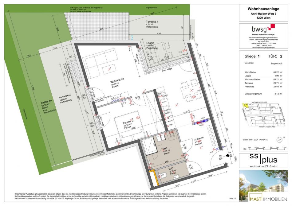*Während der Aktion werden die Verkaufspreise um 6,5 % reduziert. Dies entspricht den durchschnittlichen Nebenkosten beim provisionsfreien Wohnungskauf (1,9 % Vertrags-errichtung, 3,5 % Grunderwerbsteuer, 1,1 % Eintragungsgebühr). Die auf Basis des um 6,5% reduzierten Kaufpreises berechneten Nebenkosten sind über den Treuhänder zu begleichen. Eine mögliche Gebührenbefreiung gem. § 25a iVm § 25b Gerichtsgebührengesetz kann zusätzlich in Anspruch genommen werden.