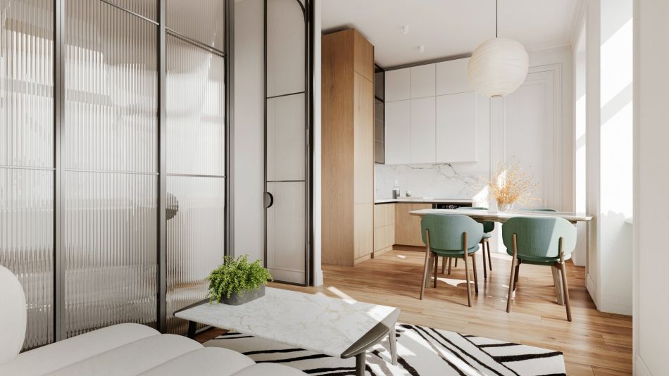Besonders raffiniert: Die moderne Glaswand mit Schiebetür trennt das Schlafzimmer optisch ab, ohne Licht oder Luftigkeit zu nehmen. So entsteht ein loftartiger Eindruck – mit zusätzlicher Privatsphäre für den Schlafbereich, in dem sich auch ein Kleiderschrank perfekt einfügt. Gleichzeitig bleibt im Wohnbereich ausreichend Platz für eine ausziehbare Couch – ideal, wenn einmal Gäste übernachten möchten.