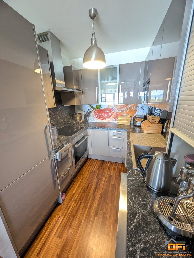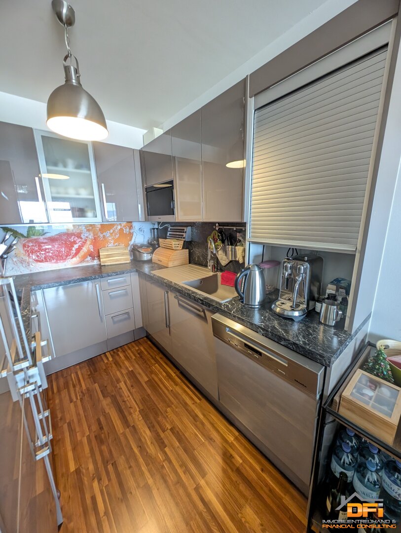 Die Küche ist mit allen notwendigen Einbaugeräten (Herd samt Ceranfeld, Dunstabzug sowie Kühlschrank mit Gefrierfach.