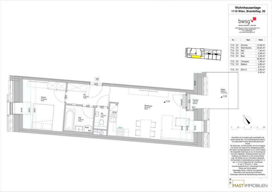 Die Wohnung befindet sich im 4. Liftstock (1. Dachgeschoss) und verfügt über 50,95 m² Wohnfläche + eine ca. 8,17 m² große Freifläche.