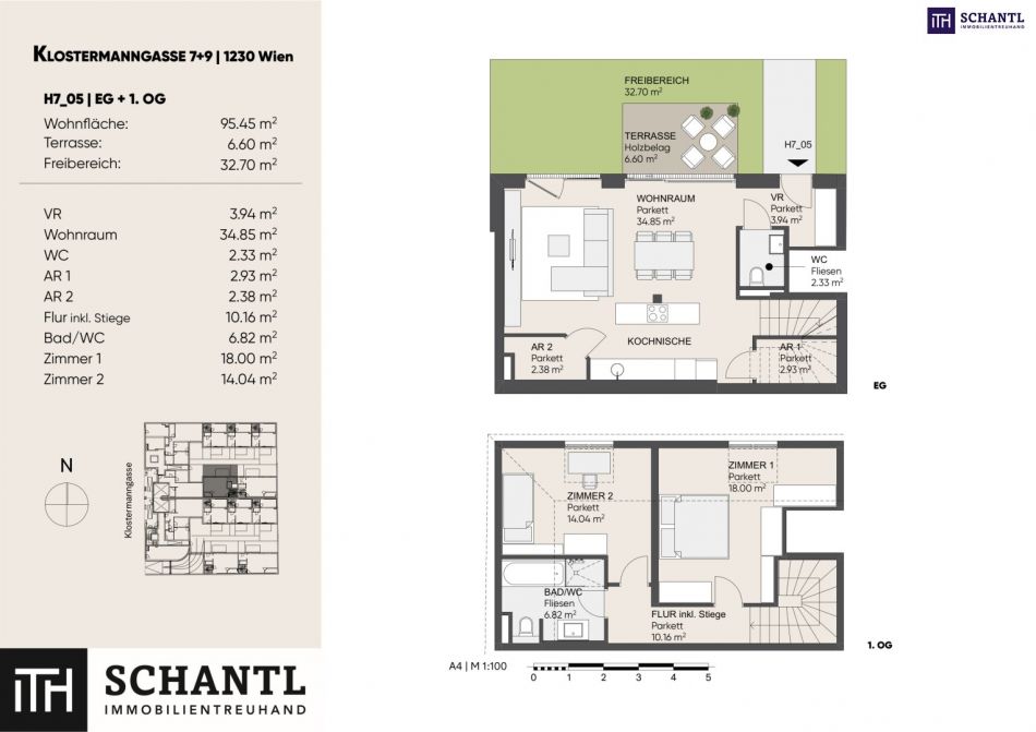 Wohnfläche: ca. 100,04m² + Terrasse: ca. 6,6m² + Eigengarten: ca. 31,80m² + Kellerabteil: ca. 8,27m²