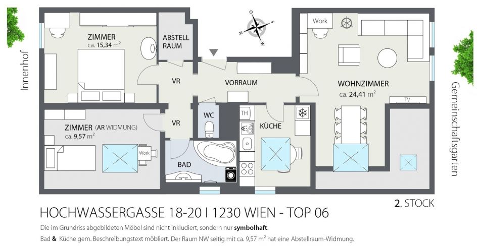 Die Wohnung liegt im Innenhof einer Wohnhausanlage im 2. Stock (ohne Lift) und verfügt über ca. 75,37 m² (laut Nutzwertgutachten). Das Schlafzimmer (ca. 15,34 m²) ist Richtung Norden und ein kleines Zimmer ( = Abstellraum-Widmung mit ca. 9,57 m²) ist Richtung Nord-Westen orientiert. Das Wohnzimmer ist in Richtung Süden ausgerichtet. Vom geräumigen Vorraum sind die separate gebrauchte Küche, das südseitige Wohnzimmer, der Abstellraum, das separate WC, und das Badezimmer zentral begehbar.
