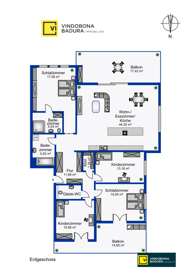 Vorraum (11,67m²), WC (1,84m²), Abstellraum (1,39m²), Zimmer 1 (17,75m²), Zimmer 2 (13,16m²), Zimmer 3 (13,98m²), Zimmer 4 (10,51m²), Wohnbereich (44,29m²), Bad 1 (5,72m²), Bad 2 (4,74m²), Balkon 1 (16,18m²), Balkon 2 (14,65m²); Loggia (1,11m²);
