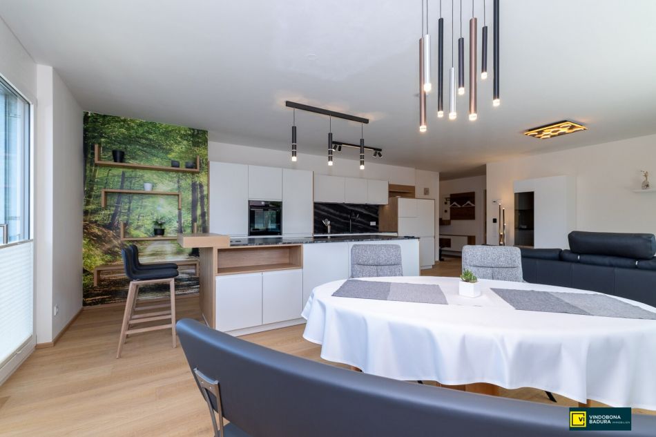 - Voll ausgestattete Küche mit Steinplatte und modernen Markengeräten (Bora, Neff, Miele)