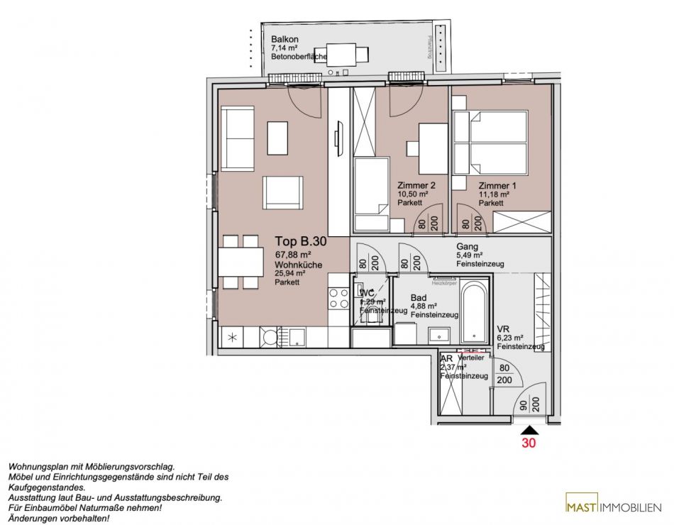Die Wohnung befindet sich im 4. Liftstock und verfügt über 67,88 m² Wohnfläche + einen 7,14 m² großen Balkon.