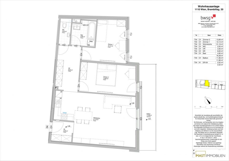 Die Wohnung befindet sich im 1. Liftstock und verfügt über 76,38 m² Wohnfläche + einen 11,96 m² großen Balkon.