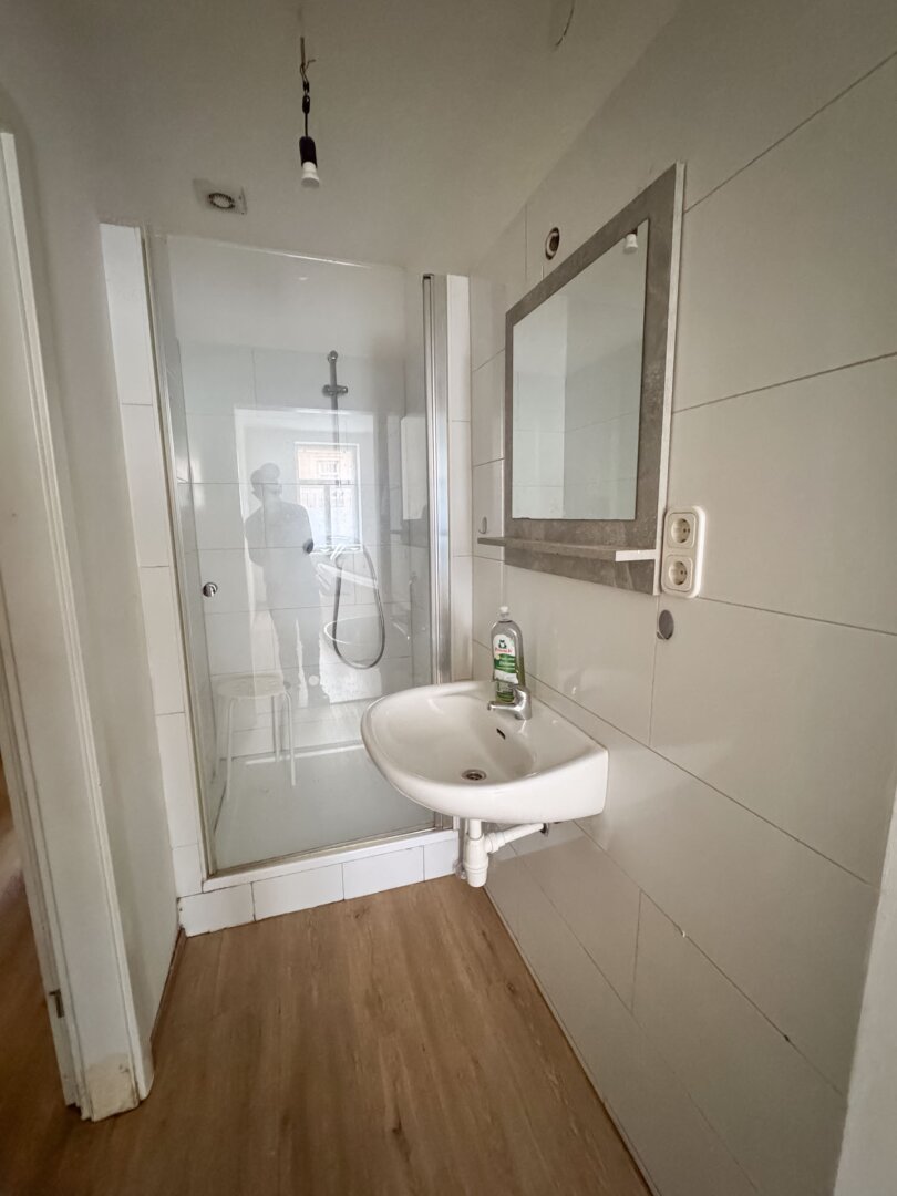 - ein Durchgangsbadezimmer mit Dusche und Waschbecken