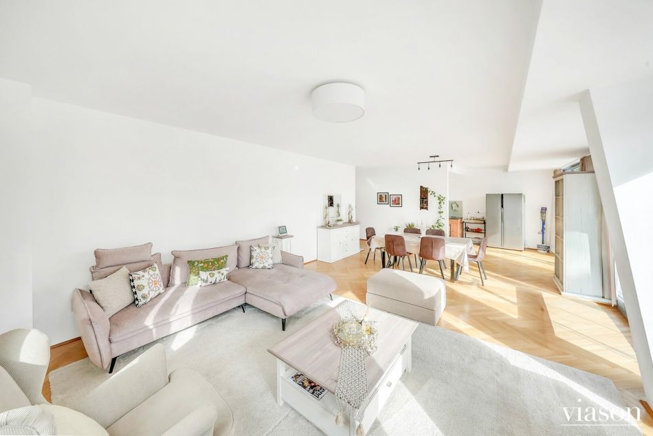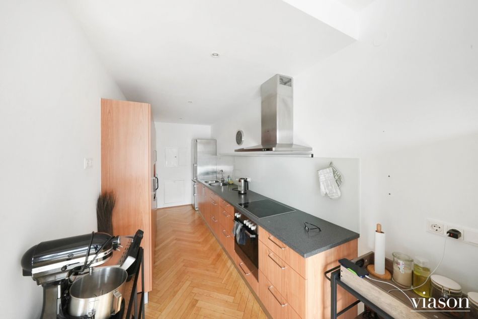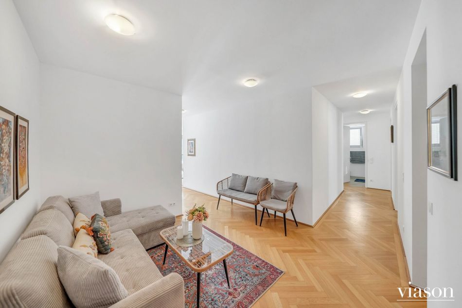 Vom einladenden Vorzimmer gelangen Sie in das Herzstück der Wohnung: die beeindruckende, ca. 57 m² große, sonnendurchflutete Wohnküche. Die Küche ist geschickt durch eine Trennwand teilsepariert, was für eine klare Struktur sorgt, ohne die Offenheit zu verlieren.