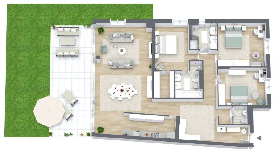 - Freiflächen: ca. 61,58 m² Terrasse & ca. 92,77 m² Eigengarten