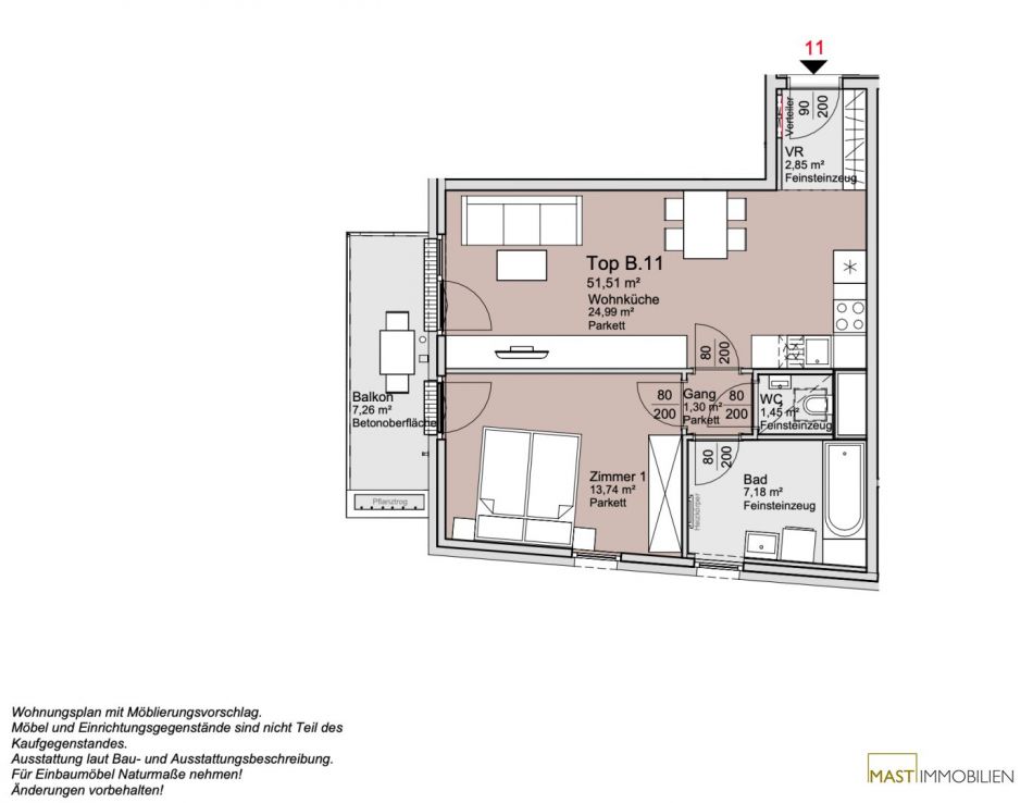 Die Wohnung befindet sich im 2. Liftstock und verfügt über 51,51 m² Wohnfläche + ein 7,26 m² großer Balkon.