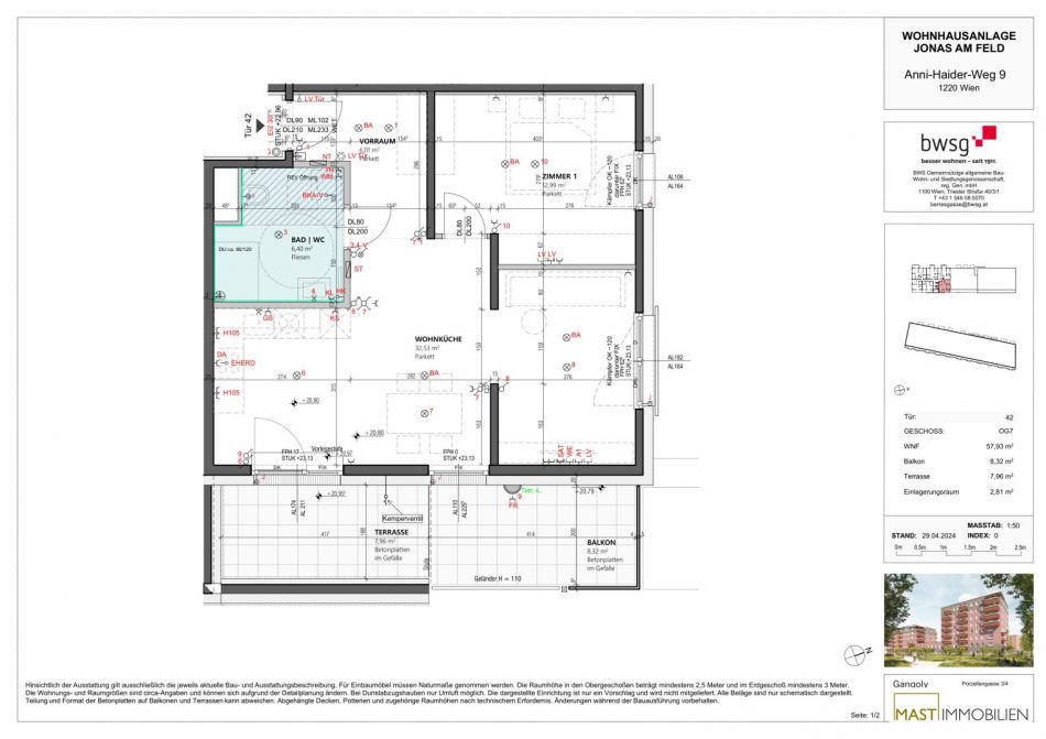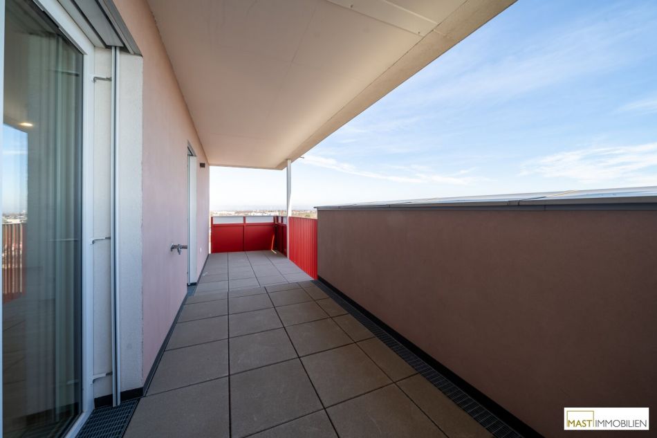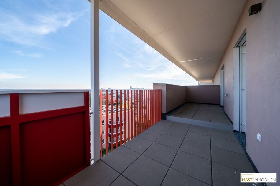 Die Wohnung befindet sich im 7. OG und verfügt über 57,93 m² Wohnfläche + einen 8,32 m² großen Balkon + eine 7,96 m² große Terrasse.