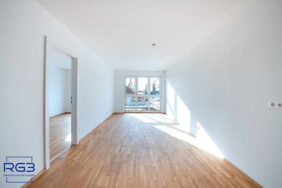 Geradeaus öffnet sich der Wohnbereich. Hier geht der Küchenraum fließend in das großzügige Wohnzimmer über. Der Raum ist angenehm geplant, hell und sehr gut möblierbar. Vom Schlafzimmer gelangen Sie direkt auf die Loggia mit einem wunderbaren Blick in den Südwesten Richtung Alte Donau, zu der Sie nur ca. 170m Gehweg haben.