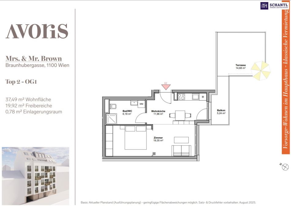 Wohnfläche: ca. 37,49m² + Balkon: ca. 5,24m² + Terrasse: ca. 14,68m² + Kellerabteil: ca. 0,78m²