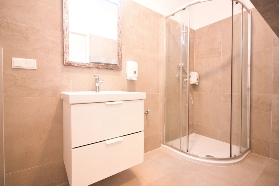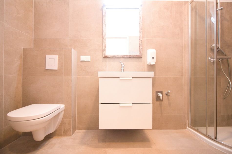Bad mit Waschbecken, Dusche und WC