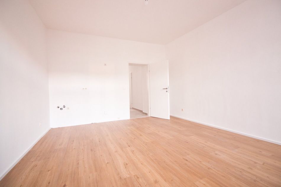 Geradeaus öffnet sich die gut geschnittene Wohnküche mit knapp 20 m², die sich besonders hell präsentiert und dank des durchdachten Grundrisses vielfältige Einrichtungsmöglichkeiten bietet.