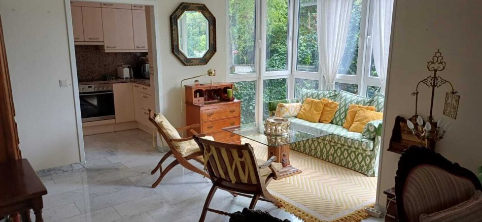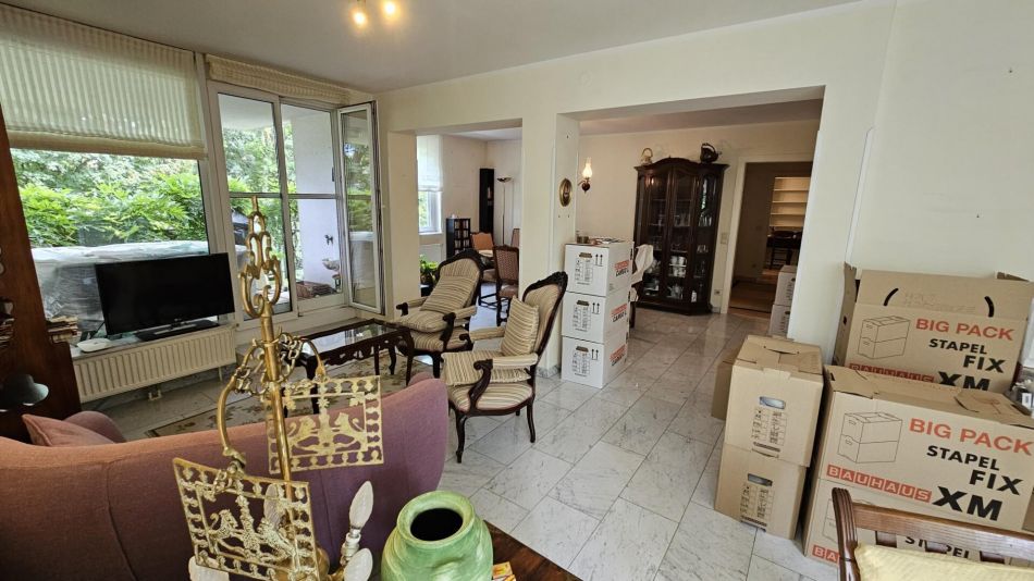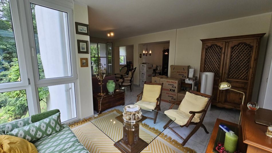 großes, lichtdurchflutetes Wohnzimmer mit Wintergarten & Balkon mit Blick ins Grüne (der Raum kann bei Bedarf für ein weiteres 4 Zimmer abgetrennt werden)