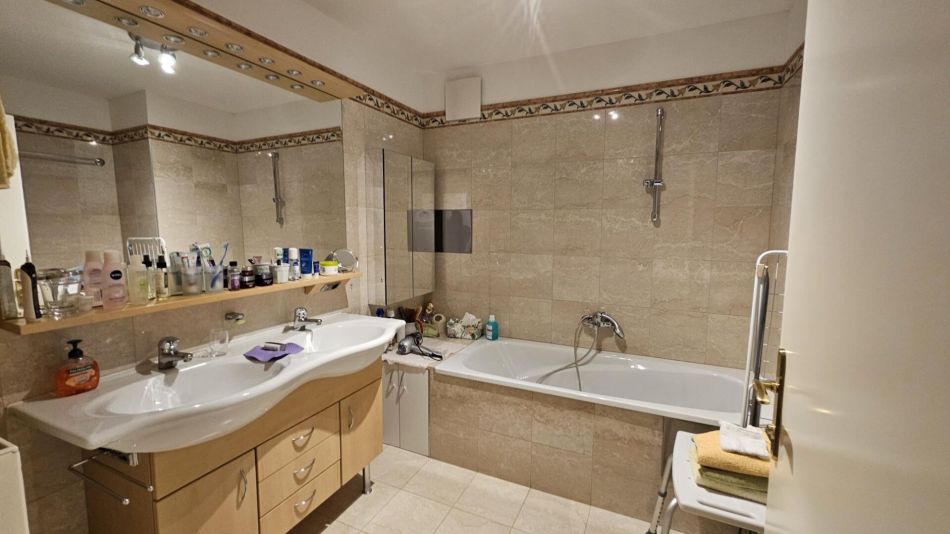 großzügiges Badezimmer mit Doppelwaschbecken, Wanne und Dusche