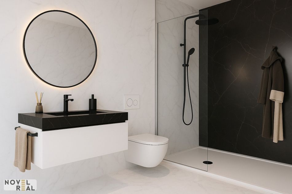 Modernes Badezimmer mit Walk-in-Dusche, WC und Waschmaschinenanschluss