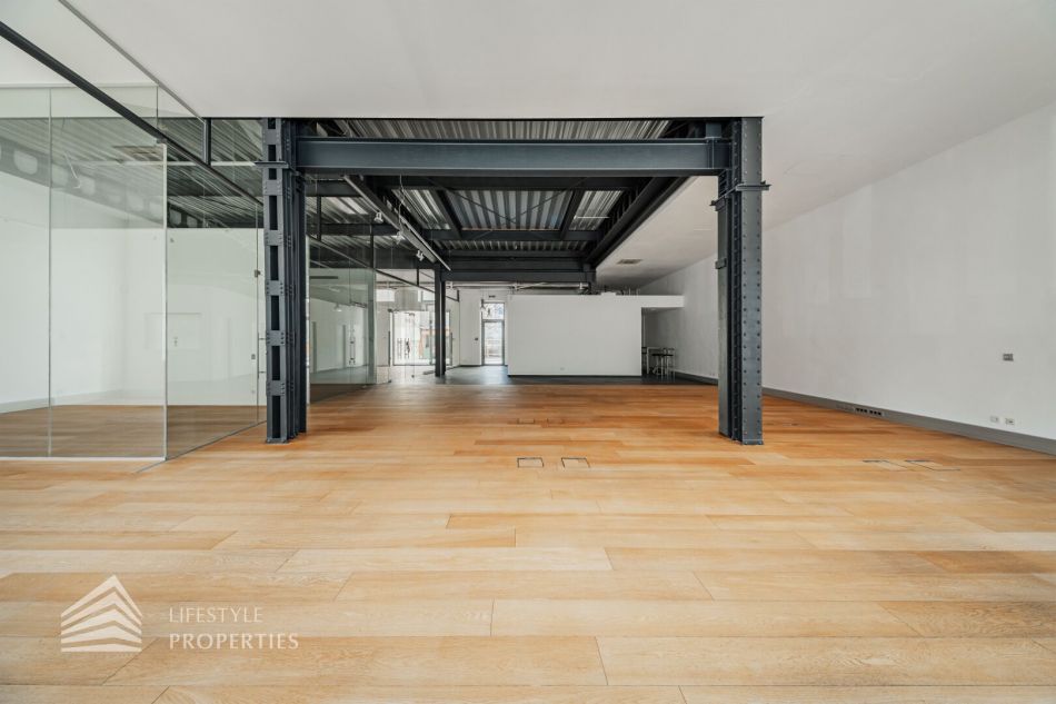 Das Geschäftslokal zeichnet sich durch die offene Raumgestaltung aus. Viele große Fenster versorgen die Räumlichkeiten mit viel Licht und präsentieren die Ware in bestem Licht. Die Küche ist mit allen notwendigen Geräten ausgestattet und verfügt über ausreichend Stauraum. Die Fotos zeigen die Räumlichkeiten, wie sie damals ausgesehen haben, als sie für Bürozwecke genutzt wurden, und wie sie im Moment aussehen.